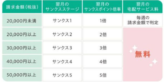 おトク①・・・サンクスステージ2以上で宅配サービス料無料おトク②・・・サンクスステージに応じてサンクスポイント倍率が変化(ステージ2で2倍、ステージ5なら5倍)おトク①・・・1月はサンクスステージ3となり、1月企画回(1回~4回)の宅配サービス料は無料になります。おトク②・・・1月企画回(1回~4回)のサンクスポイントは3倍になります。サンクスステージ判定の対象となるものは以下のとおりです。